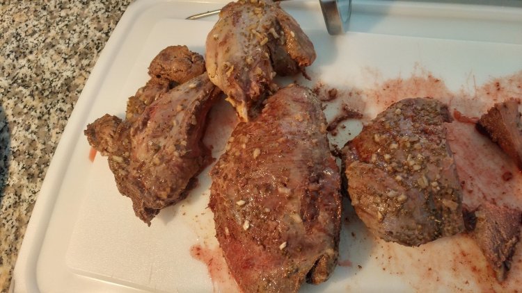 I cooked the breasts and thighs/legs the same way I cook venison, medium well and pink in the middle. Wild meat cooks fast, and if over cooked, it will become essentially inedible.