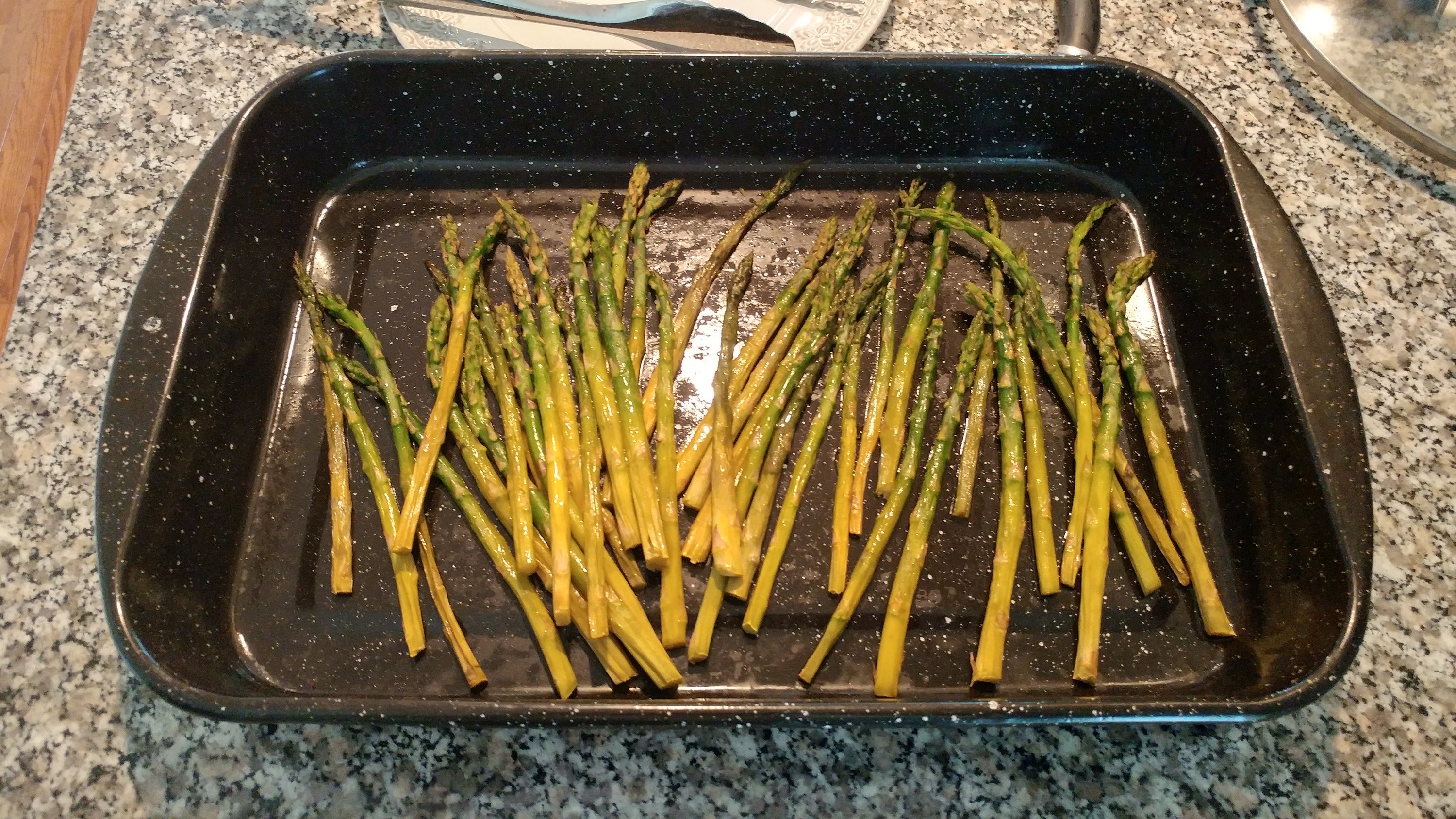 Tonight was steak night and I added a little something extra. After pan frying my steak in olive oil, I spread a little olive bruschetta on top. My asparagus was baked with olive oil too.