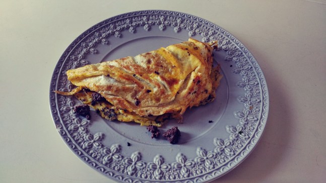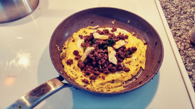 This three egg omelet was cooked in butter and made with steamed spinach (fresh spinach microwaved with water), venison pan-fried in olive oil with Italian seasoning and then marinated artichoke hearts from a jar were added last. Sounds fancy? It’s more simple than fancy. Just basic, wholesome ingredients. This omelet is not combined with toast or hash browns to keep it a properly combined meal of protein plus vegetable.
