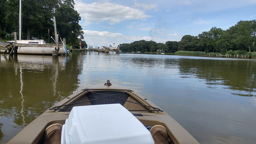 I was determined to go fishing this past Saturday, no matter what time of day it turned out to be. After getting my “chores” done and checked off the list, it was about 1:30pm as I left my driveway with kayak and gear. This would be a challenge, because the day was sunny and warm, sending the fish away into small nooks in the shade. I headed to a peaceful and quiet creek off the Chesapeake Bay. Even if I found no fish, I knew it would be a relaxing paddle.