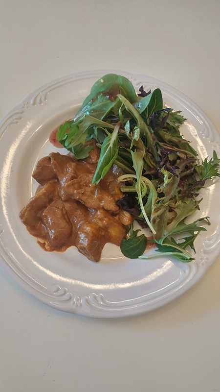 The Tikka Masala sauce required cream and water, and I used half and half… and keep adding ingredients to the pan until I was satisfied with the consistency. The frenched lamb ribs where so much fun to eat I finished them before I could add lamb to the sauce… they were like lamb popsicles. The venison was cooked nicely and I added the pieces with cut artichoke hearts to the Tikka Masala. As shown below, we added greens and dressing on the side. This was so good! I still have some venison steak and ground venison in the freezer from last season and will be sure to make this again.