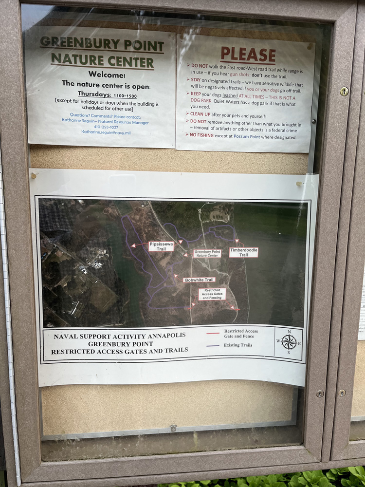 Words cannot easily describe the complex cornucopia of benefits to humans, wildlife, plant life and the surrounding bodies of water that this land provides. Greenbury Point is surrounded by Carr Creek, the Severn River, the Chesapeake Bay and Whitehall Bay. The Greenbury Point Nature Center, open Thursdays 11am-3pm, is located at the “main gate” to the large service road, which leads to the interior trails of Greenbury Point Conservation Area. The nature center is a showcase for the local fauna and flora of the conservation area and has its own little paths along Carr Creek. Adding a second golf course would literally be wiping away a critical, delicate, and environmentally pure landscape.