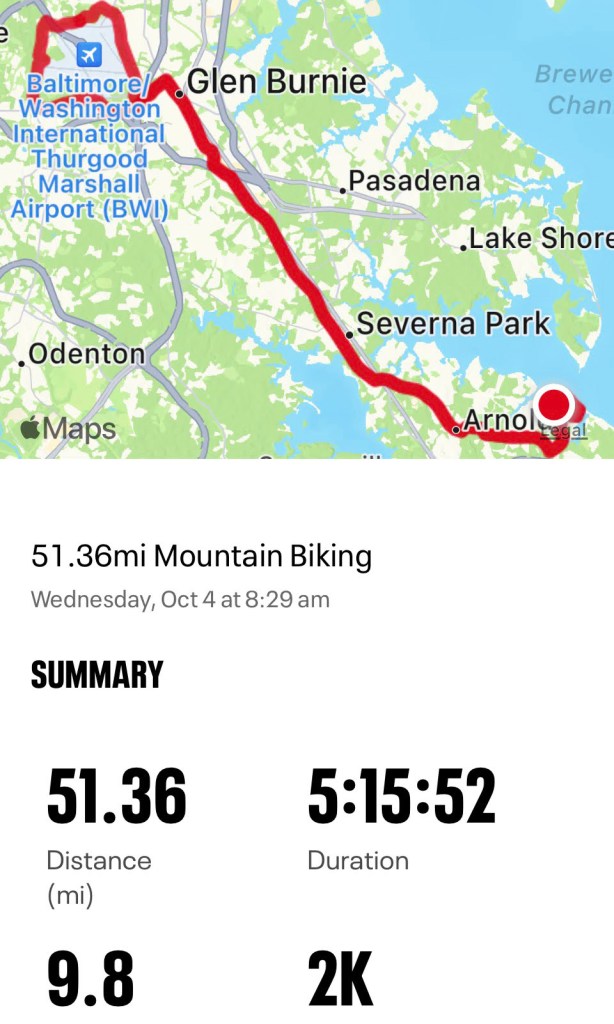 After this point, for me, it was just a matter of retracing my route and adding a couple extra loops in my neighborhood to break the 50-mile mark. Next goal: 100 miles. Maybe I’ll just take this journey twice – or perhaps follow the Lifeline 100 route, which utilizes the Anne Arundel County Trails as well.