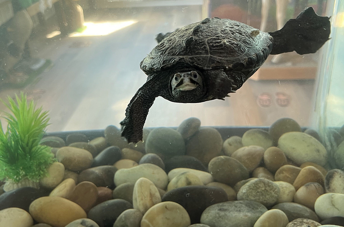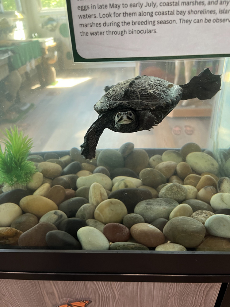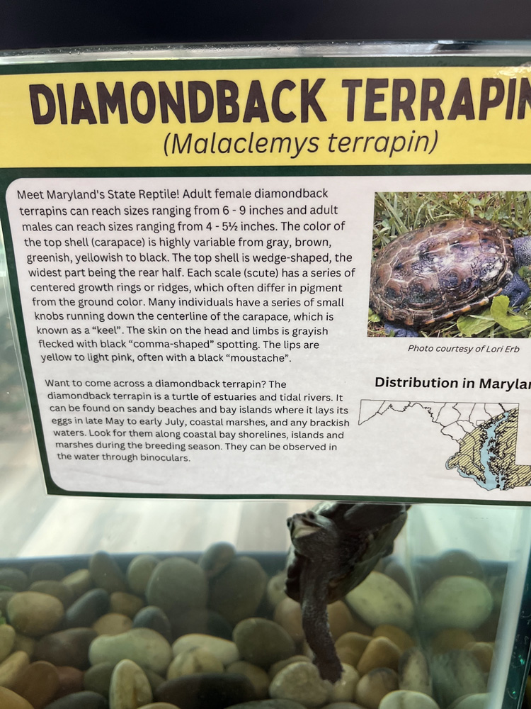 The large and popular marina at Smallwood State Park is on Mattawoman Creek, just off the Potomac River. There is a nice bait shop and plenty of parking for launching fishing boats or kayaks. The Discovery Center, which is in the marina area, is an excellent place to learn about local plants and animals and features a few large water tanks for playful turtles. The very active Maryland Terrapin (see photo) swimming here was clearly enjoying its stay. There is an art center, an historic tobacco barn with displays about the property, large and clean bathrooms, and a campsite with six small rental cabins.