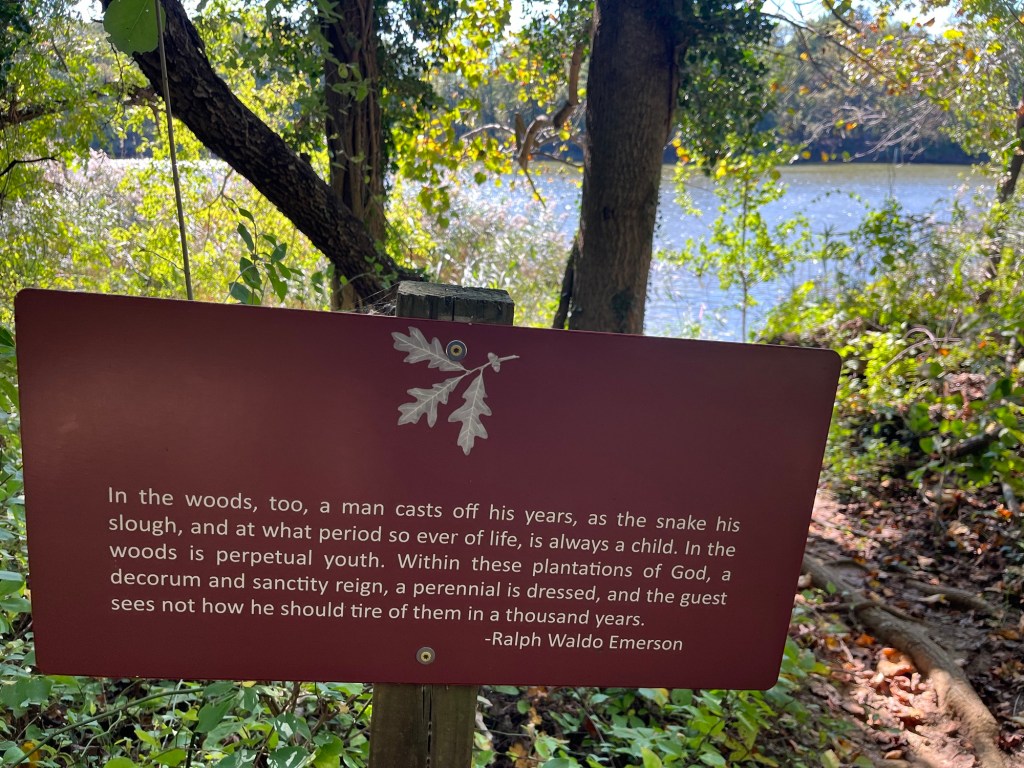 We started on a typical walk through Poet’s Nature Trail behind the Nature Center and beside Carr Creek, but noticed some changes about half way through. The resource manager and crew had been busy making improvements to the property. There was a wide mulch covered path through the middle, which lead to their shoreline restoration project on Carr Creek.