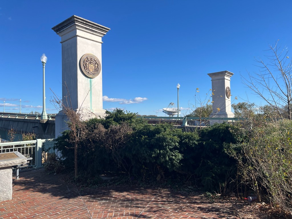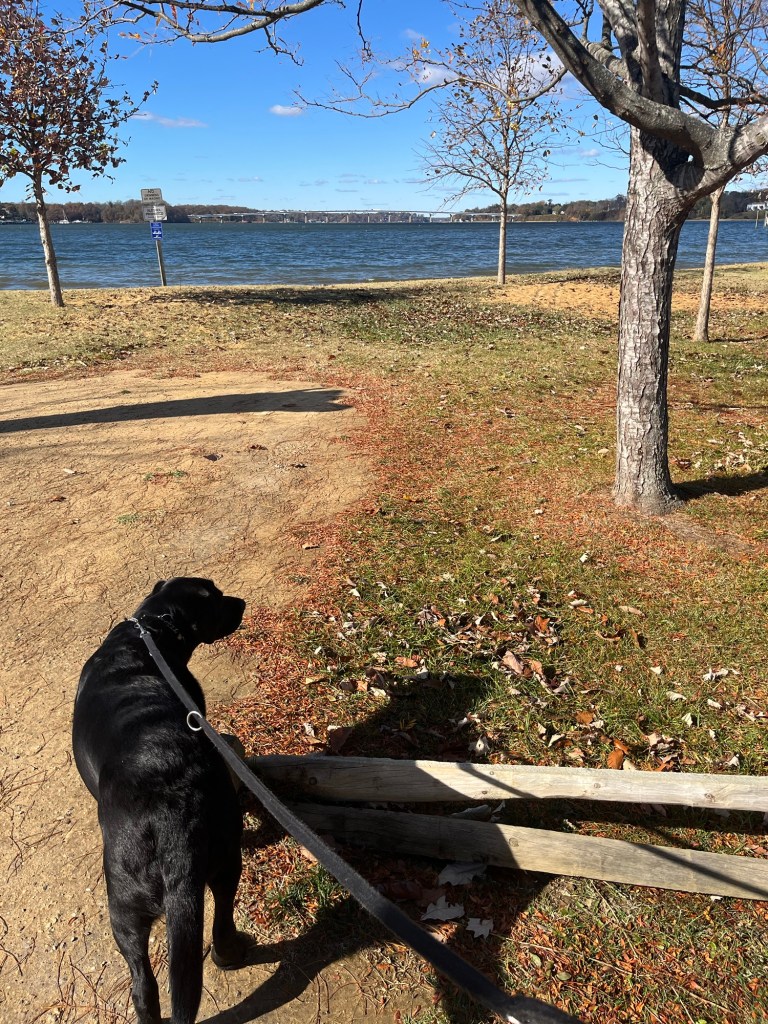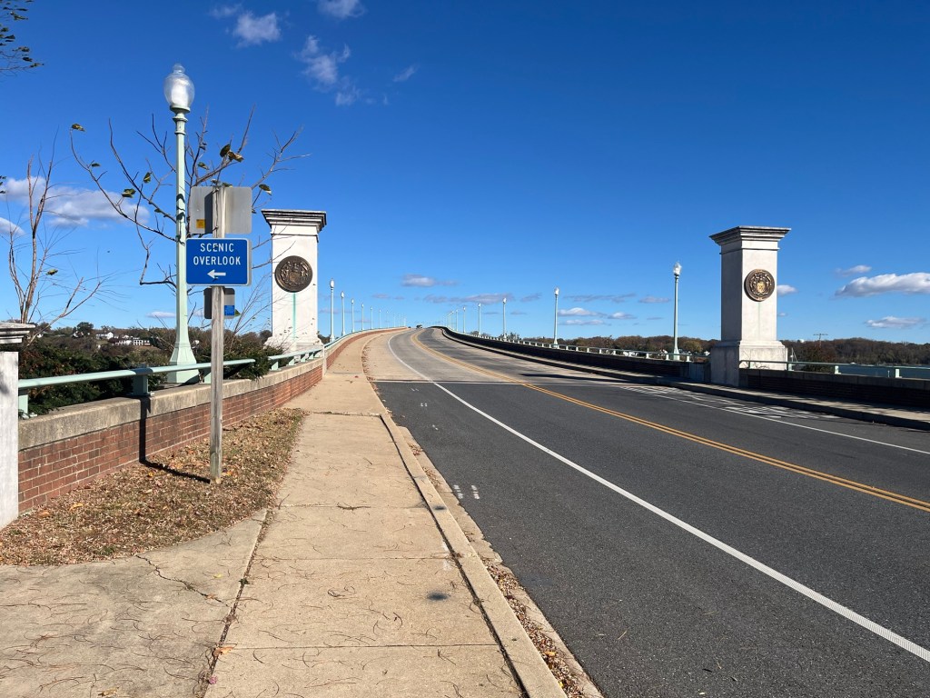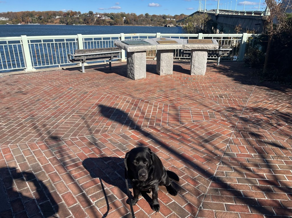 Yesterday’s afternoon dog walk was a new and dramatic experience. I have ridden my bike over this bridge many times, but this is the first time I had a walk on it with Tucker. We parked at Jonas and Anne Catharine Green Park, which sits at the base of the north side of the bridge. After a short stroll through the park, we walked up the steep grassy hill and started on our bridge walk.
