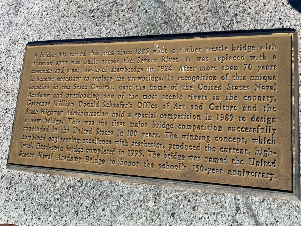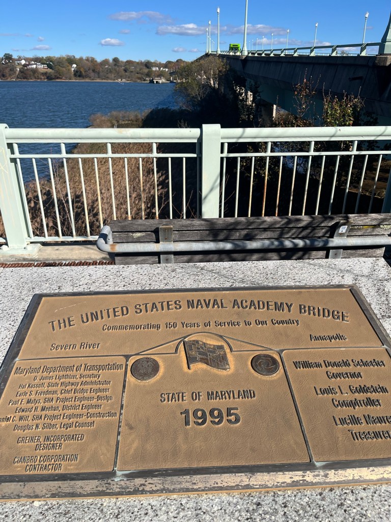 Our walk across the U.S. Naval Academy Bridge was a great experience, but could also be part of a longer walk into colonial Annapolis and the Naval Academy. It is not uncommon to see large groups of midshipmen jogging across the bridge as part of their fitness routine. Enjoy the view!